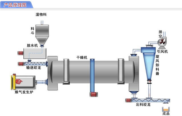 豆渣烘干機(jī)主要由供熱源、進(jìn)料機(jī)、回轉(zhuǎn)滾筒、出料機(jī)、引風(fēng)機(jī)、卸料器和配電柜構(gòu)成;脫水后的濕豆渣進(jìn)入烘干機(jī)后,在滾筒內(nèi)均布的抄板翻動(dòng)下,在烘干機(jī)內(nèi)均勻分散與熱空氣充分接觸,加快了烘干傳熱﹑傳質(zhì)。在烘干過(guò)程中,豆渣在帶有傾斜度的抄板和熱介質(zhì)的作用下,至烘干機(jī)另一段星形卸料閥排出烘干成品。在方案設(shè)計(jì)當(dāng)中、充分考慮到豆渣水分含量大、蛋白含量高、粘性大的特點(diǎn),并采取了系列合理的技術(shù)和工藝來(lái)加以解決,以確保良好的烘干效果。